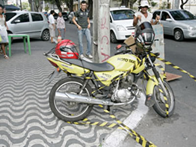 A moto da vítima permaneceu no local do crime mesmo depois da remoção do cadáver. Testemunhas do assassinato foram arroladas. (Foto: Natinho Rodrigues)