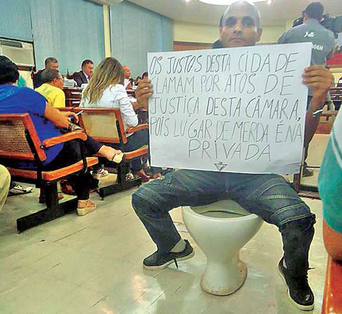 Quando a insatisfação ultrapassa os limites do tolerável, nada mais justo do que protestar. Principalmente, se a manifestação for criativa. Na sessão de ontem, 22, na Câmara Municipal de Juazeiro do Norte, um cidadão da cidade não se fez de rogado e levou sua privada para mandar um papo reto ao presidente da Casa, Antônio de Lunga (PSC), envolvido na “farra do sabão”, dado em primeira mão pelo Jornal do Cariri e Aqui CE, tendo repercussão nacional.