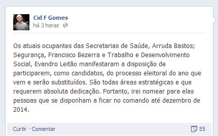O governador informou que os três secretários "manifestaram a disposição de participarem, como candidatos, do processo eleitoral do ano que vem e serão substituídos". Cid Gomes ainda informou, via rede social, que vai nomear para as pastas pessoas que se disponham a ficar nas secretarias até dezembro de 2014.